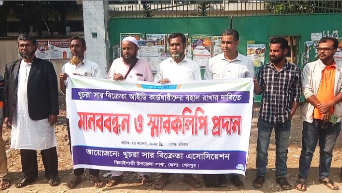 সাইফুল ইসলাম জুয়েল, ঝিনাইগাতী (শেরপুর) সংবাদদাতা: শেরপুরের ঝিনাইগাতীতে খুচরা সার বিক্রেতা আইডি কার্ডধারীদের বহাল রাখার দাবিতে মানববন্ধন ও স্মারকলিপি প্রদান করেছে ঝিনাইগাতী উপজেলা শাখার খুচরা সার বিক্রেতা এসোসিয়েশন। রোববার (২৩