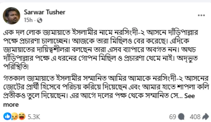 এর আগে, নরসিংদীতে নির্বাচনী প্রচারণায় গেলে এক জামায়াতকর্মীর সঙ্গে বাগবিতণ্ডা জড়িয়ে পড়েন সারোয়ার তুষার। বাগবিতণ্ডার একটি ভিডিও সামাজিক যোগাযোগ মাধ্যমে ভাইরাল হয়ে যায়।