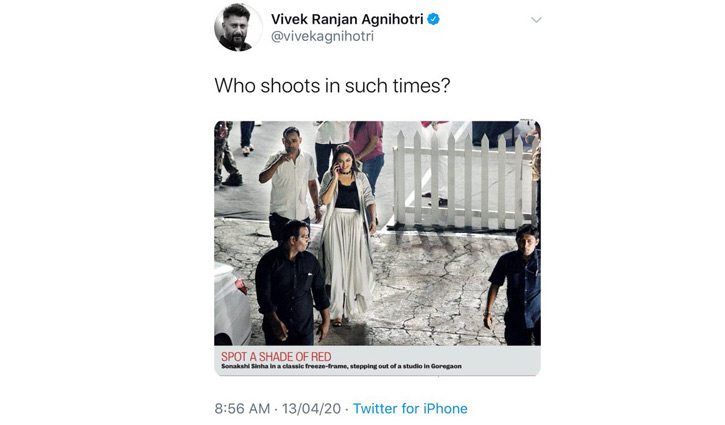 টু্ইটে সোনাক্ষীকে নিয়ে পত্রিকায় প্রকাশিত একটি প্রতিবেদনের ছবি পোস্ট করেন বিবেক অগ্নিহোত্রী। ক্যাপশনে লিখেছেন, ‘এই সময় কে শুটিং করে?’ মূলত, পত্রিকায় সোনাক্ষীর আগের শুটিংয়ের একটি ছবি প্রকাশ করা হয় এবং ক্যাপশনে সেটি উল্লেখও করা হয়েছে।